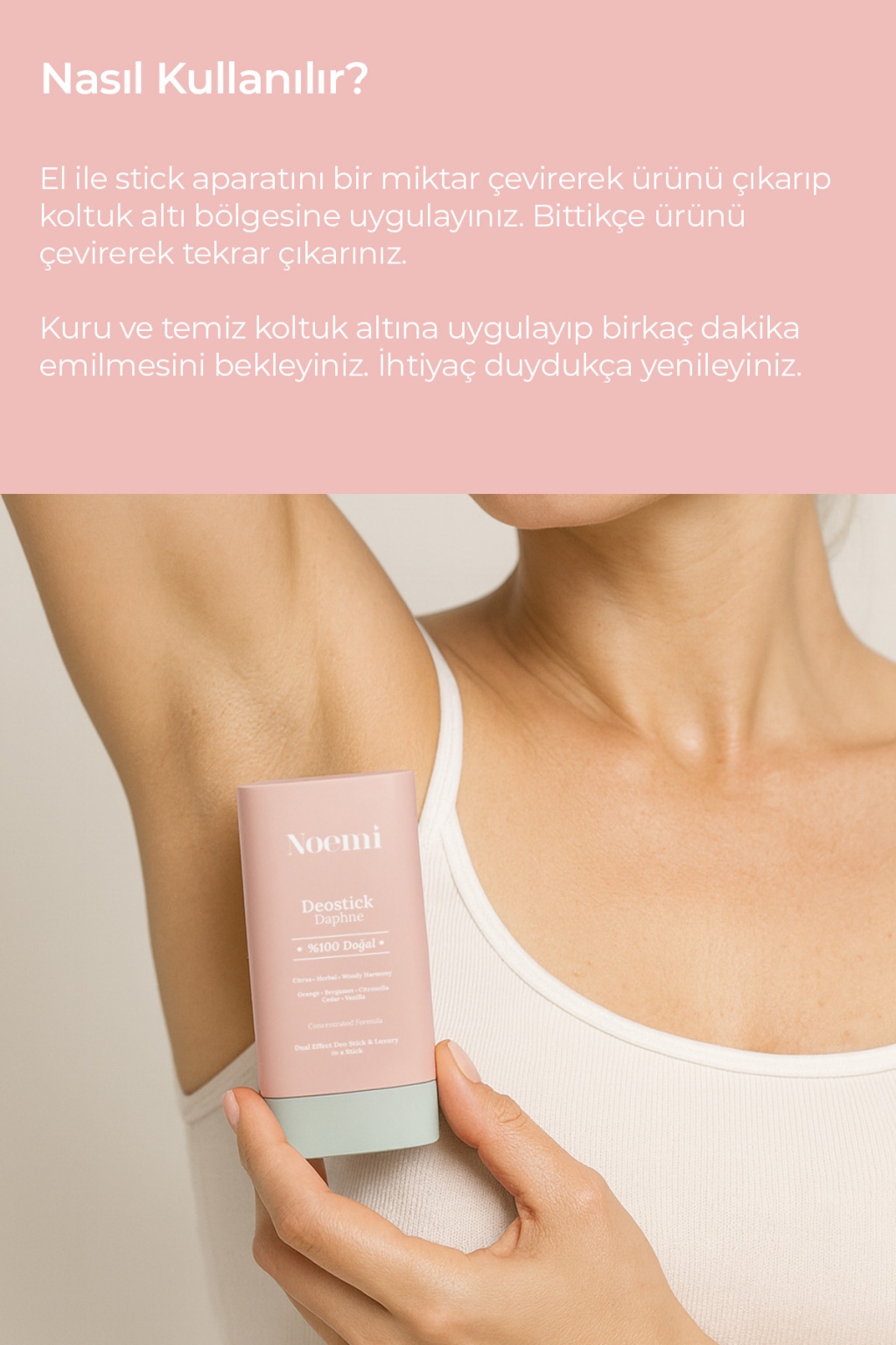 Daphne %100 Doğal Deo Stick içeriğindeki besleyici ve onarıcı yağlar ile koltuk altı bölgesini tahriş etmeden bakım yapar, içerisinde bulunun doğal uçucu yağlar sayesinde ter kokusunu önlemeye yardımcı olarak gün boyu ferah ve taze bir his sağlar.