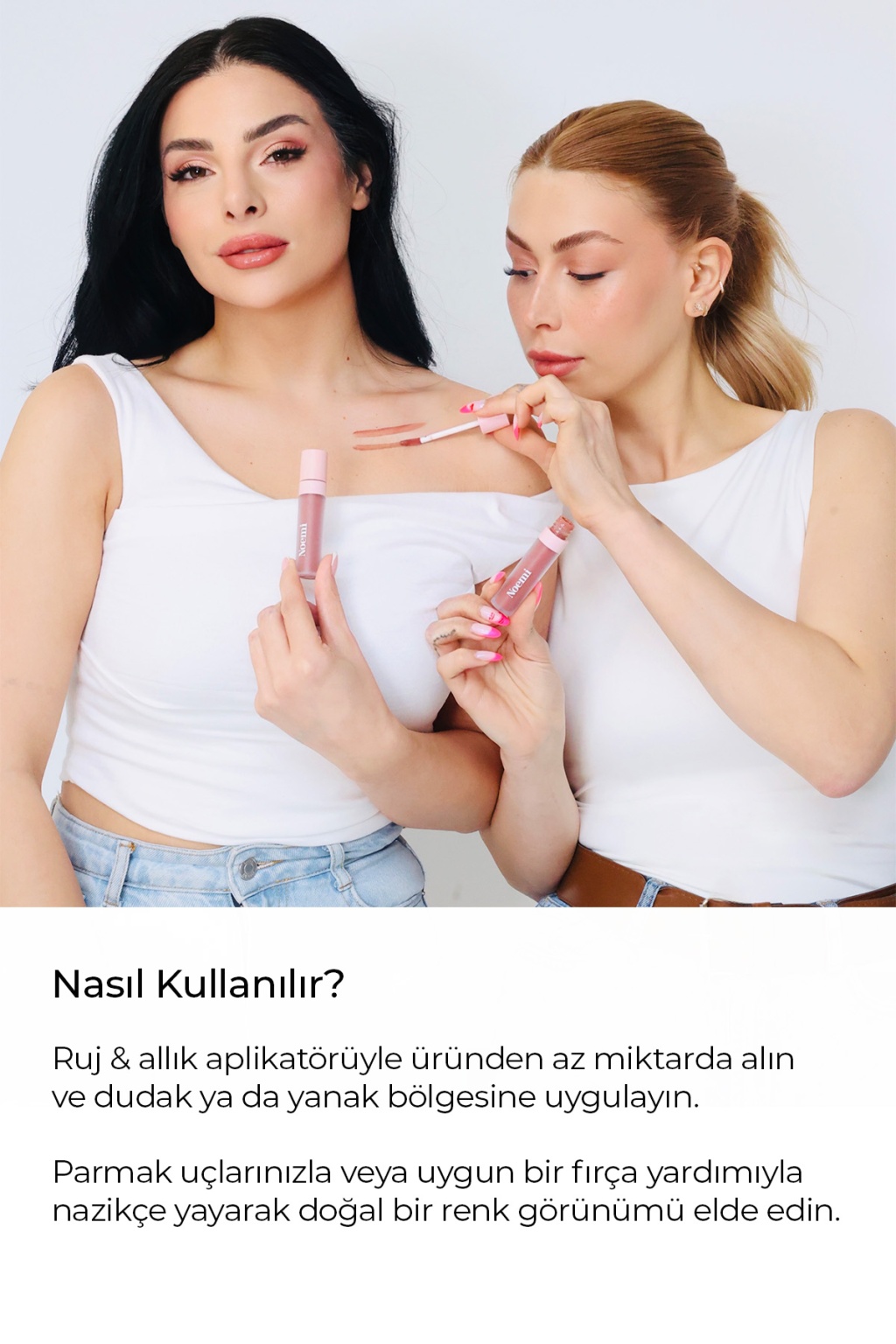 Kullanım: Ruj&Allık fırça aplikatörü yardımı ile alınıp, dudak ve yanak bölgesine parmak uçları veya fırça ile yayarak uygulanır ve doğal bir görünüm elde edilir.