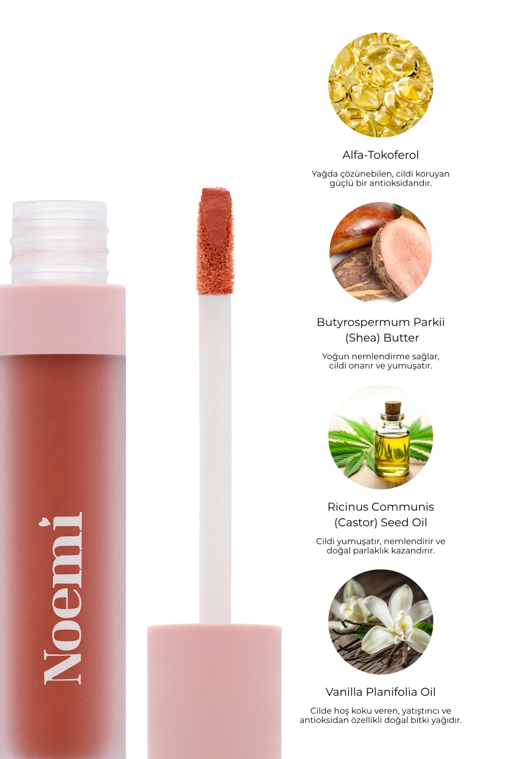 İçeriğinde bulunan organik argan yağı, Vitamin E değerli yağ kombinasyonları ile dudakları ve cildi nemlendirerek, doğal bir görünüm sağlar.