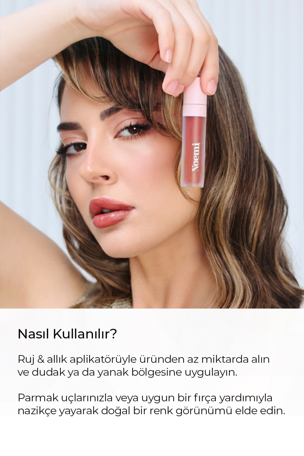 Kullanım: Ruj&Allık fırça aplikatörü yardımı ile alınıp, dudak ve yanak bölgesine parmak uçları veya fırça ile yayarak uygulanır ve doğal bir görünüm elde edilir.